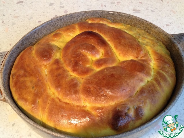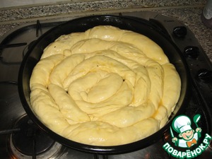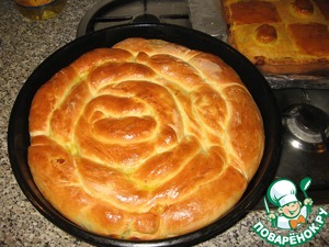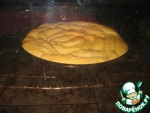 Духовка у нас заждалась. Смазываем пирог сливочным маслом. Совсем чуть-чуть. Для куража. И вот он уже набирает очки...