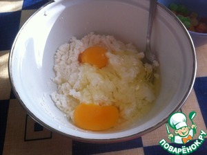 Творог разминаем вилкой. Добавляем 2 яйца и хорошенько перемешиваем