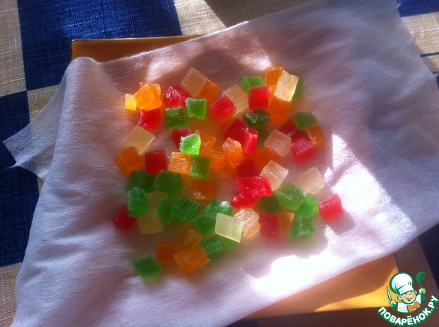 Добавляем 2 ст. л. сахара, чепотку соли, 3 ст. л. манной крупы, перемешиваем и оставляем тесто на 20 минут. Сушеные ананасы (на мармеладки похожи) замачиваем в кипятке на 5 минут