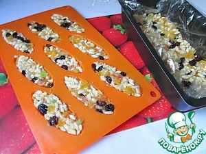 Сухофрукты и цукаты режем небольшими кусочками, соединяем с рисово-ореховой смесью.