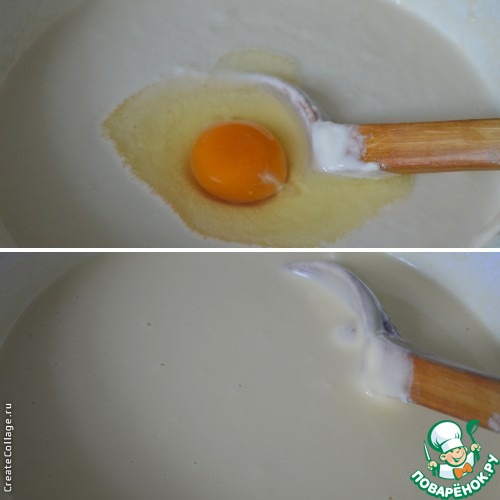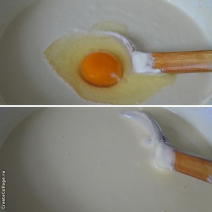 По одному вмешать яйца, каждый раз хорошо перемешивая.