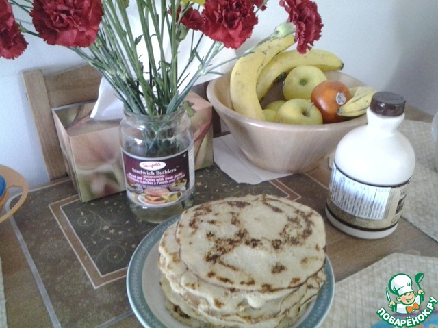 Блины получаются несладкими, поэтому лучше подавать с медом или вареньем.