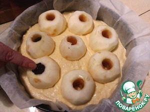 Сверху разместите яблоки, вдавливая их в тесто. Во внутрь каждого яблока положите 2 ежевики.