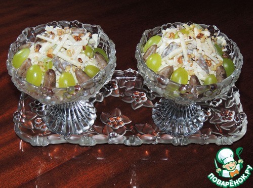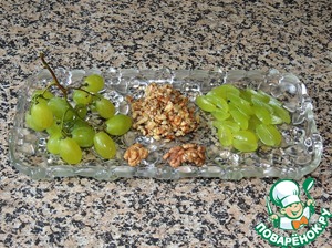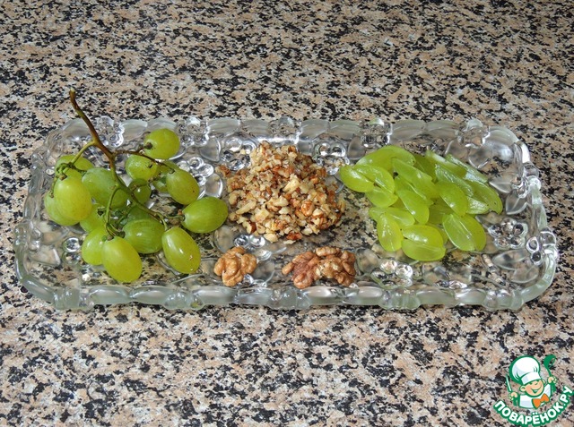• Грецкие орехи измельчить не слишком сильно (удобно просто ножом), слегка обжарить. Виноград (крупный зеленый или красный, без косточек!) порезать, как и сердечки, на четвертинки. Часть винограда отложить для украшения.