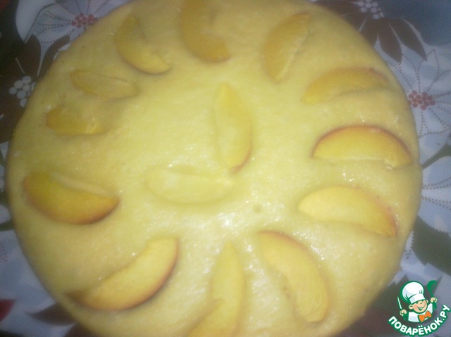 Тесто получается жидковатым. Выкладываем половину теста в форму, дальше по кругу персики и сливку, разрезанную тонкими дольками. Выпекаем при температуре 180, 30 мин. Таких будет у нас два коржа.