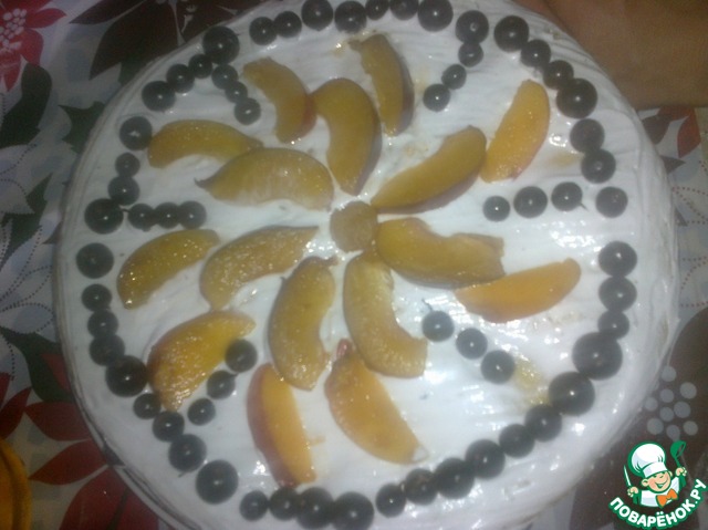 Дальше взбиваем белки (2)до пиков, добавляем по чуть чуть сахара (0.5 ст), не переставая взбивать. Смазываем кожи кремом, сверху я украсила персиком и смородинкой.