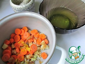 Добавляем к горячему бульону нарезанные овощи, обжаренный лук, цедру апельсина, щепотку молотого тмина, соль и черный перец. В оригинале вместо тмина использовалась зира, я не очень люблю эту специю, заменила ее на тмин и, надо сказать, не прогадала.