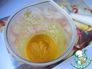 Ждем, пока суп немного остынет, вливаем апельсиновый сок и пюрируем его блендером.