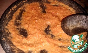 Как я уже сказала, всё дело в соусе! Итак, приступим! Помидоры обдали кипятком, сняли кожицу и вырезали сердцевинку. Орехи, чеснок, перец и помидоры кладём в блендер, добавляем сахар и измельчаем. Если есть возможность измельчить в ступе, то лучше будет консистенция. Как я говорила ранее, здесь до сих пор никто не пользуется блендерами и не просто так.