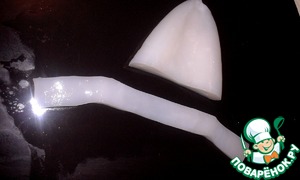 Нарезаем кальмара полосками, т. е. сначала колечками в 1 см, а потом разрезаем колечко по шву. Рыбку - кубиками.