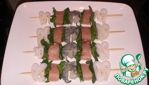 Одеваем на шпажку свободненько в произвольной последовательности, не впритык, можно проредить травкой, у меня была руккола, она как ничто подходит к морепродуктам. И выкладываем на плоское блюдо. У меня получилось так.