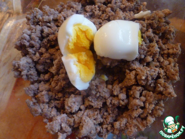 Затем фарш обжарить до готовности на растительном масле и добавить вареное яйцо.