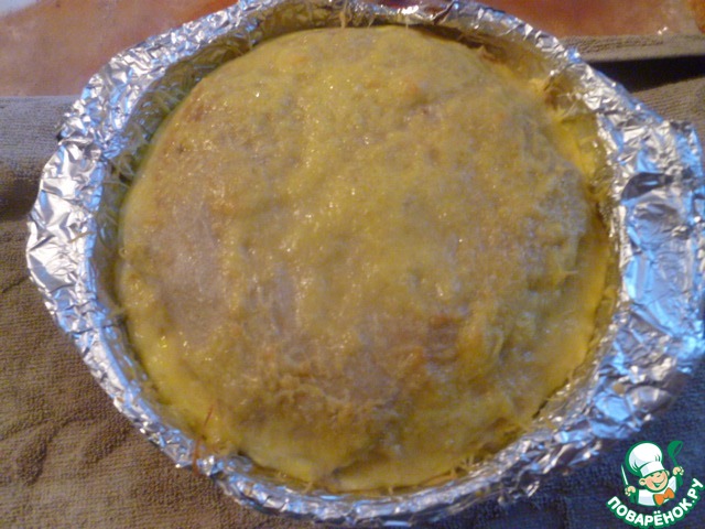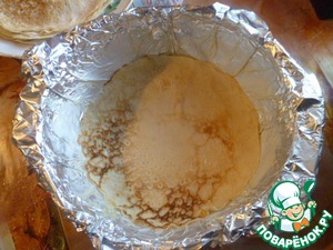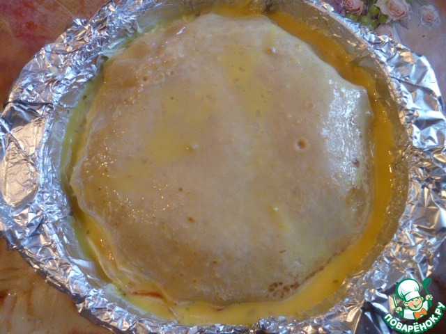 Берем форму по диаметру блина, застилаем ее фольгой, смазываем сливочным маслом.
