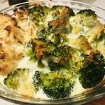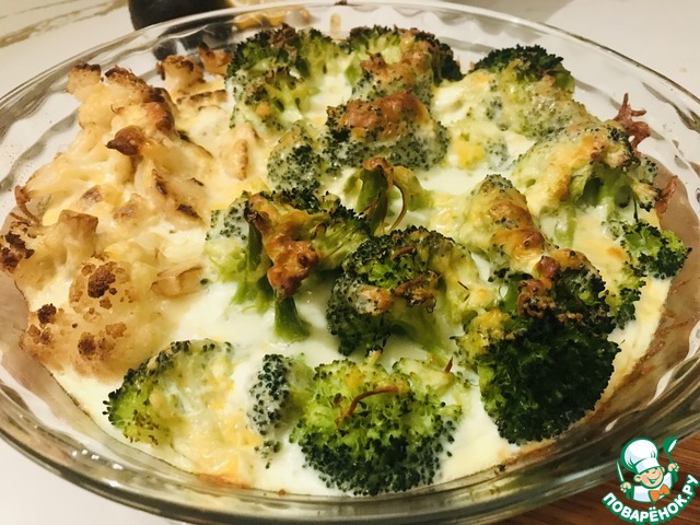 Форму для запекания смазать сливочным маслом и посыпать панировочными сухарями. Выложить брокколи в форму. Сверху залейте смесью. Поставьте в предварительно разогретую духовку (приблизительно на 30 минут)