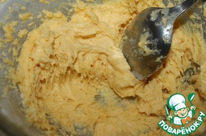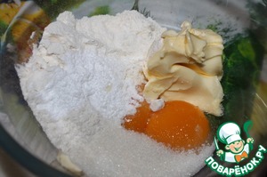 Желтки, размягченное масло, 50 г сахара, муку и разрыхлитель соединить.