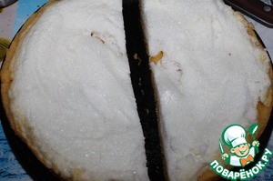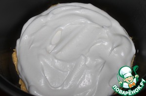Белки и 150 г сахара взбить до устойчивых пиков и размазать по тесту.