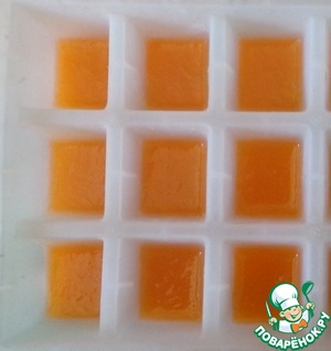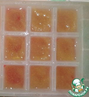 • Далее достаем абрикосовый лед из морозилки и также на 1/3 часть заполняем ячейки ягодным соком. Отправляем в морозилку.