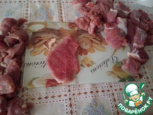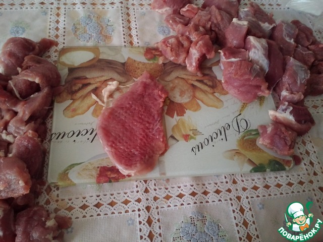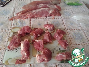 • Нарезать свиную вырезку кусочками толщиной 1,5 см.