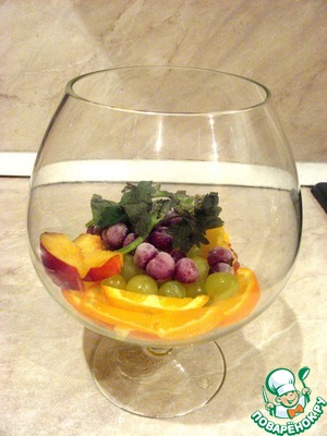 Нарезаем на кружочки 1 апельсин и ½ лимона, нарезаем на дольки 1 персик, кладем 50г вишни, 50г винограда, 2 веточки мелиссы и все кладем в кувшин.