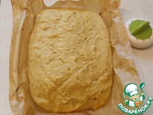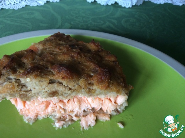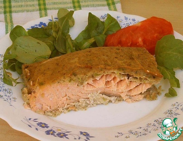 В форму положить пекарскую бумагу и смазать маслом. Положить 1/2 нашего теста прямоугольником чуть больше куска форели, которую кладем на него.