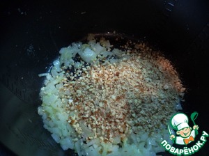 Включаем режим "жарка" и обжариваем лук, чеснок и измельченный миндаль, в течении примерно 10 мин. -