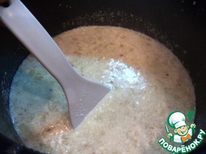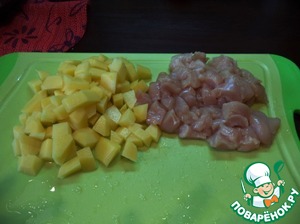 Когда филе начнет белеть, вливаем воду, сливки (в оригинале 20%, я брала 10%) и добавляем картофель.