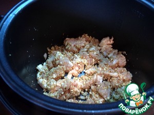 В чашу мультиварки к луку добавляем курочку, обжарим пару минут.