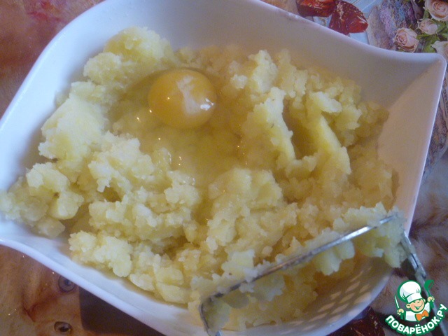 Картофель потолочь и добавить яйцо, хорошо перемешать. -