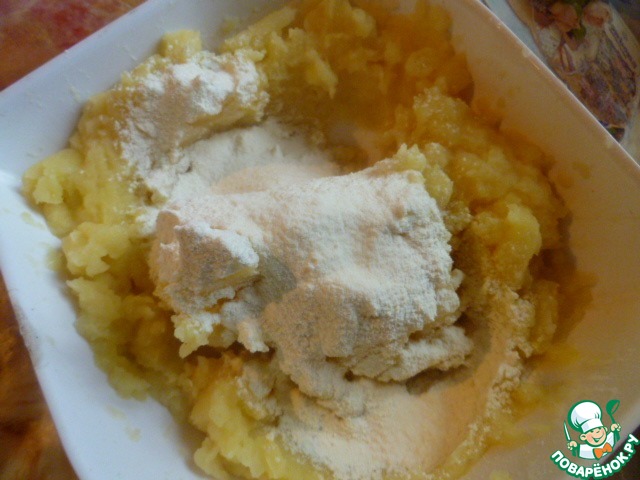 Затем добавить просеянную муку. Так как картофель бывает суховатым, а бывает водянистым, то количество муки может быть разное.