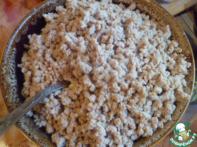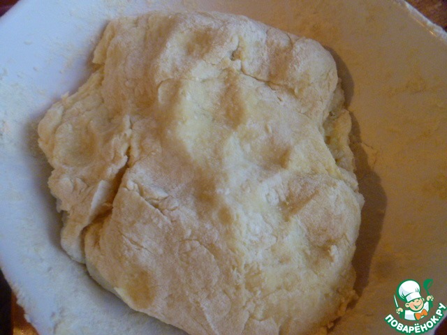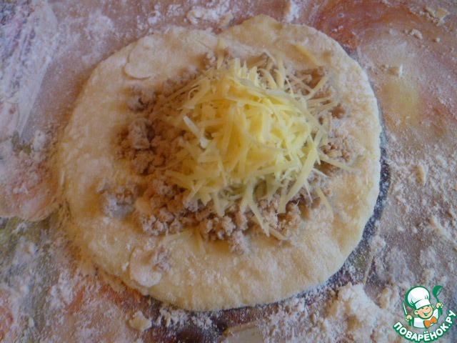 Руками в муке отрываем кусочек теста, делаем лепешку и кладем мясную начинку. -