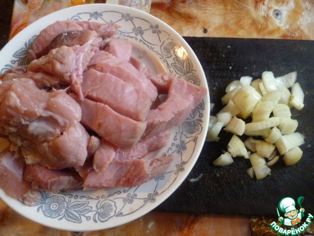 Начинка: мясо порезать кусочками, лук порезать.