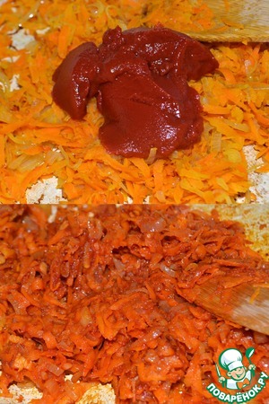 Добавить в обжаренные овощи томатную пасту, хорошо перемешать и отключить огонь.
