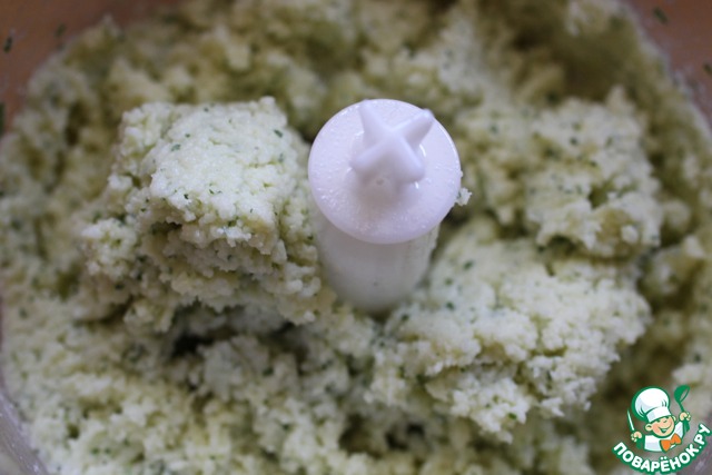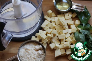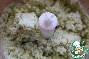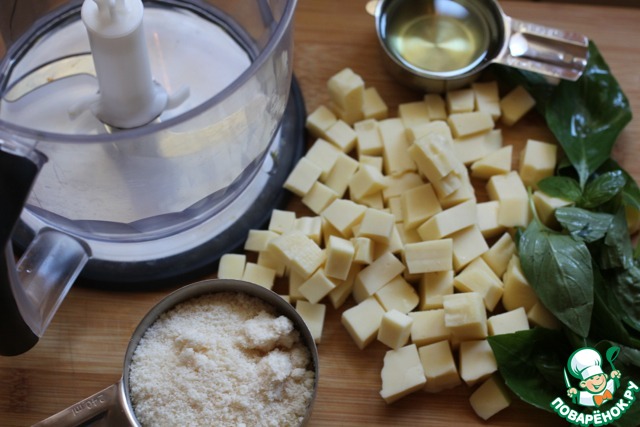 В чаше миксера измельчим в паштет моцареллу, пармезан, листья зеленого базилика и оливковое масло. -