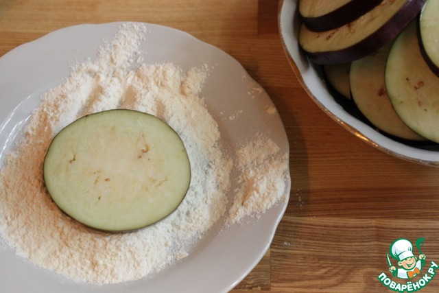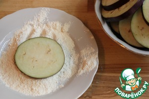 В сковороде с толстым дном разогреваем растительное масло. Баклажан панируем в муке и обжариваем до золотистой корочки.