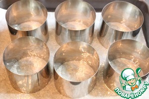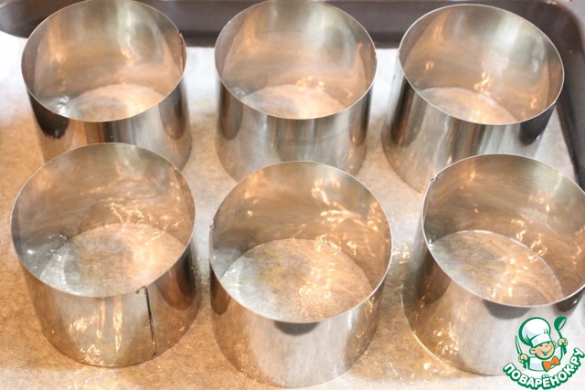Противень застелить пекарской бумагой и смазать ее маслом, установить формы. -