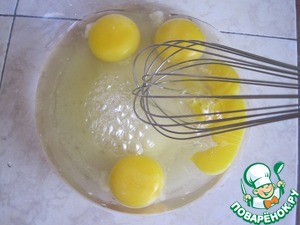 Сразу оговорюсь, что количество продуктов для бисквита рассчитано на противень 20х30 см. У меня противень гораздо больше, поэтому я, соблюдая пропорции, увеличила количество ингредиентов. И так.. Духовку включаем разогреваться до 180 градусов, противень застилаем бумагой и начинаем с бисквита-в миске взбиваем яйца с сахаром до полного растворения сахара и до увеличения массы в объёме.