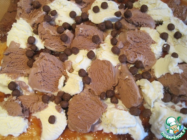 В таком виде оставляем бисквит остывать. Примерно за 10 минут достаём мороженое из морозилки, что б немного оттаяло.