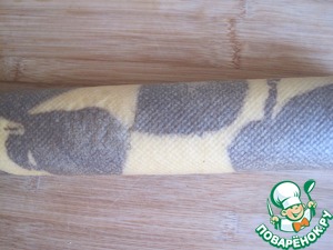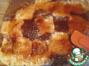 И теперь уже шоколадным тестом заполняем свободные места на противне. В итоге у нас должен получиться вот такой пёстрый прямоугольник.