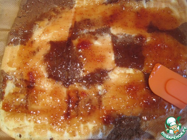 Развернём остывший бисквит и промажем его клубничным джемом.