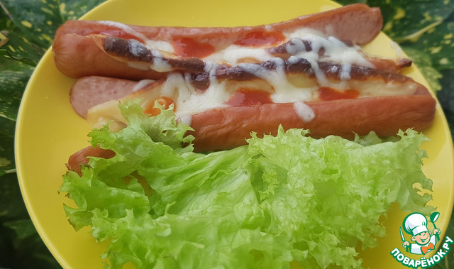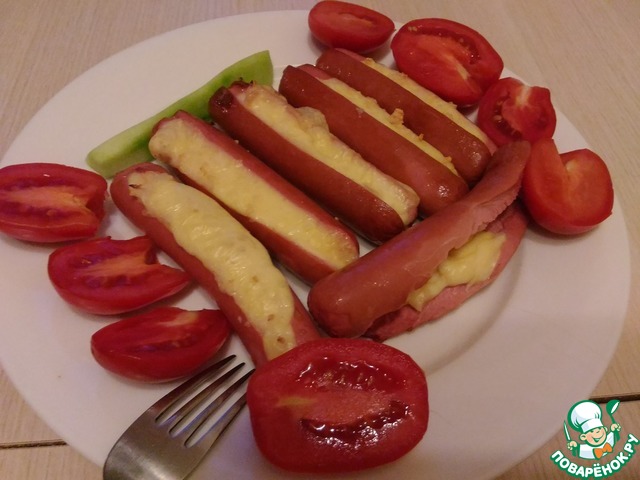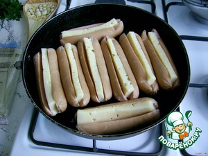 Сосиски разрезать вдоль, в разрез уложить кусочек сыра.