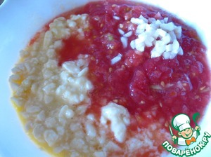 Разрезать помидор пополам, потереть на терке, отделившуюся шкурку выкинуть, слить жидкость. Мякоть помидора и измельченный ножом зубок чеснока добавить к плавленному сырку, посолить, перемешать.