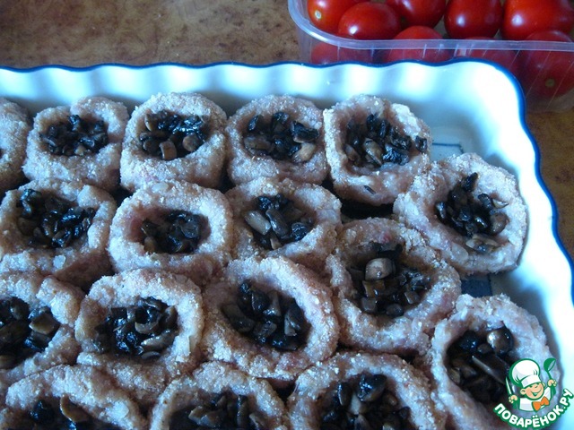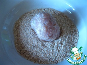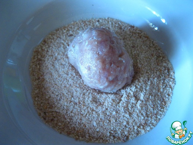 Скатать круглые шарики, размером с небольшую тефтелю (1 стол. лож. фарша), обвалять в сухарях, расплющить.