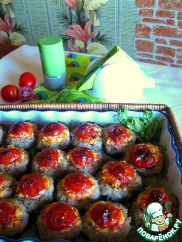 С помидорок черри срезать бочки и украсить котлетки. (С одного помидорчика можно получить 2-3 кругляшка). Завершающий штрих: сбрызнуть котлетки оливковым маслом и посыпать прованскими травами.