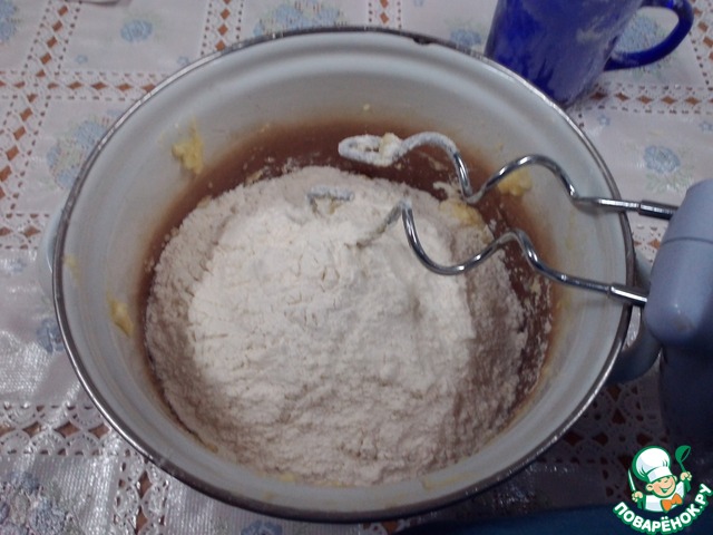 Добавить соду, гашенную уксусом, перемешать и добавить муку.