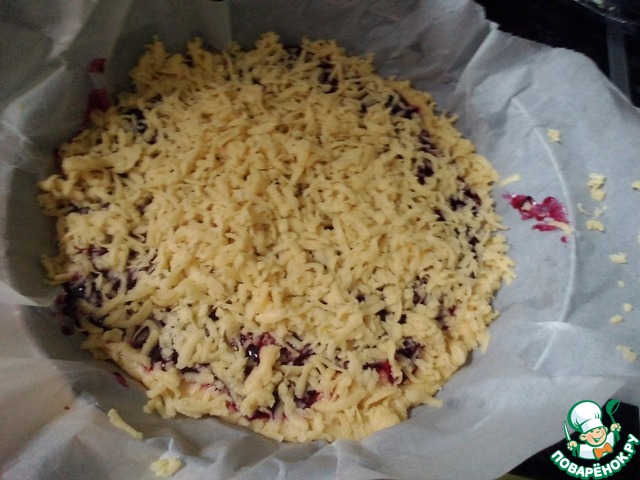 Затем большую часть распределить на сковородке, выложить варенье, затем сверху натереть меньшую часть.