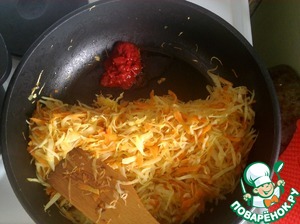 Добавить масло, томатную пасту, прожарить ее, помешивая. -