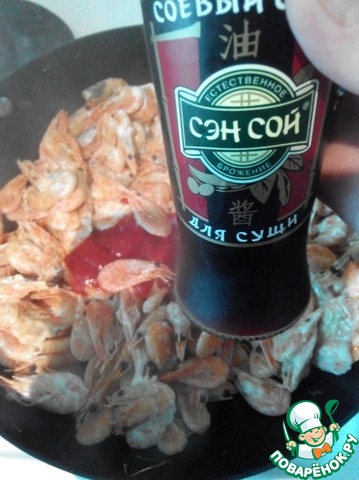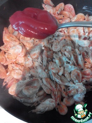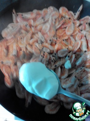 • Креветки размораживаем, промываем под проточной водой и складываем в раскаленную сковороду. Из креветок начнет выделяться жидкость...