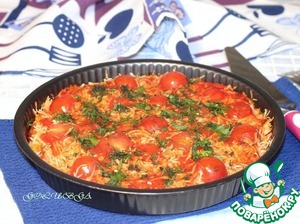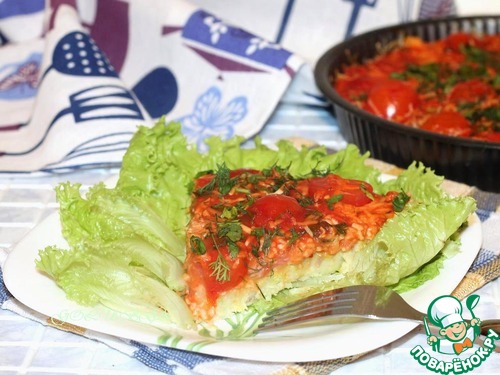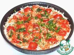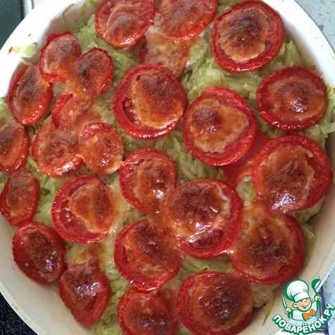 Сверху выкладываем помидоры и посыпаем промежутки между помидорами сыром.