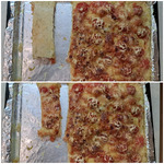 Тесто делим на 2 части. Форму для запекания смазываем сливочным маслом. Тонким слоем (около 2 см.) выложить тесто. Разогреваем духовку до t 200 С и выпекаем тесто 10-15 минут.