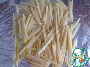 На противень для запекания кладём фольгу, смазываем фольгу растительным маслом. На фольгу укладываем одну часть картофеля, солим и перчим по вкусу.